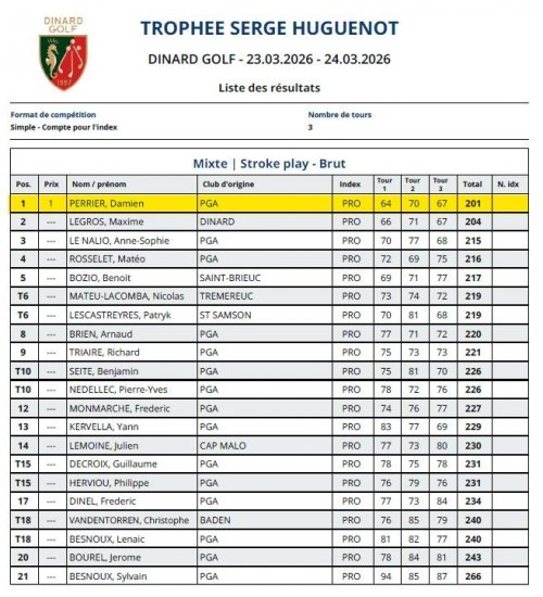 Damien PERRIER remporte ce Trophée avec un total de 201 (64, 70 et 67) suivi par Maxime LEGROS avec un total de 204 (66,71 et 67) et Anne-Sophie LE NALIO : 215 (70,77 et 68).