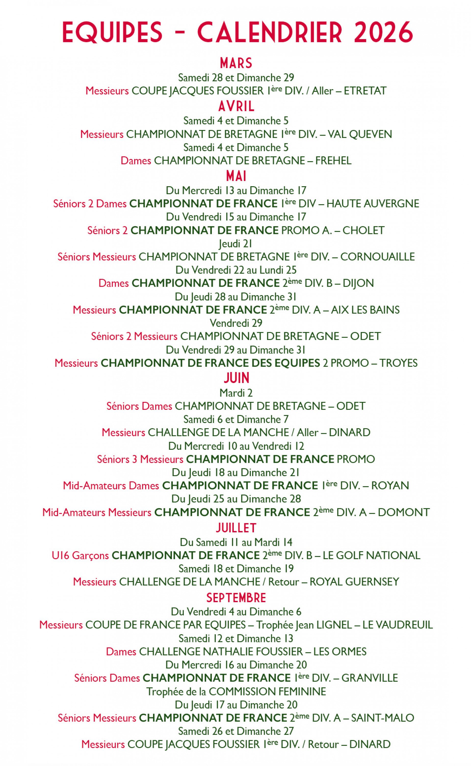 CALENDRIER DES EQUIPES 2026